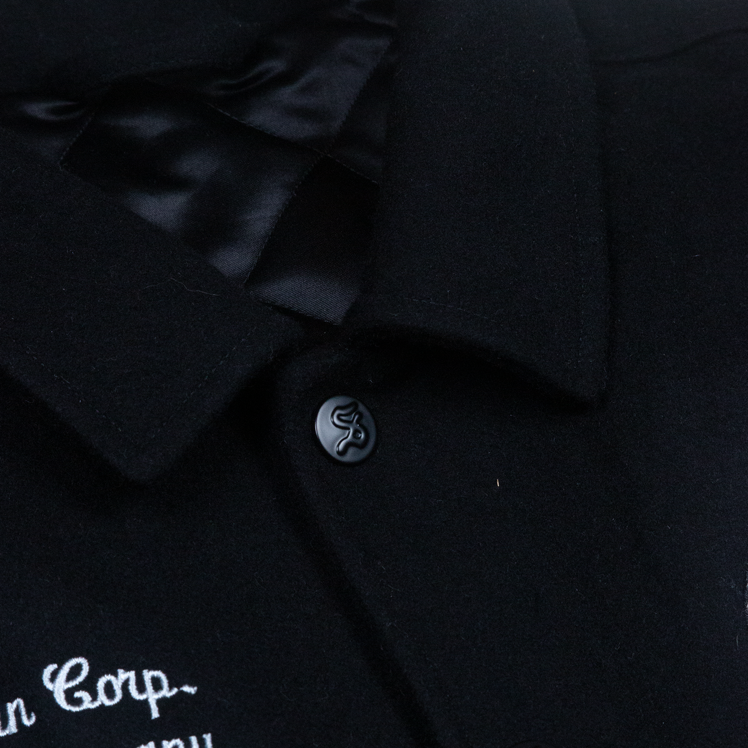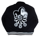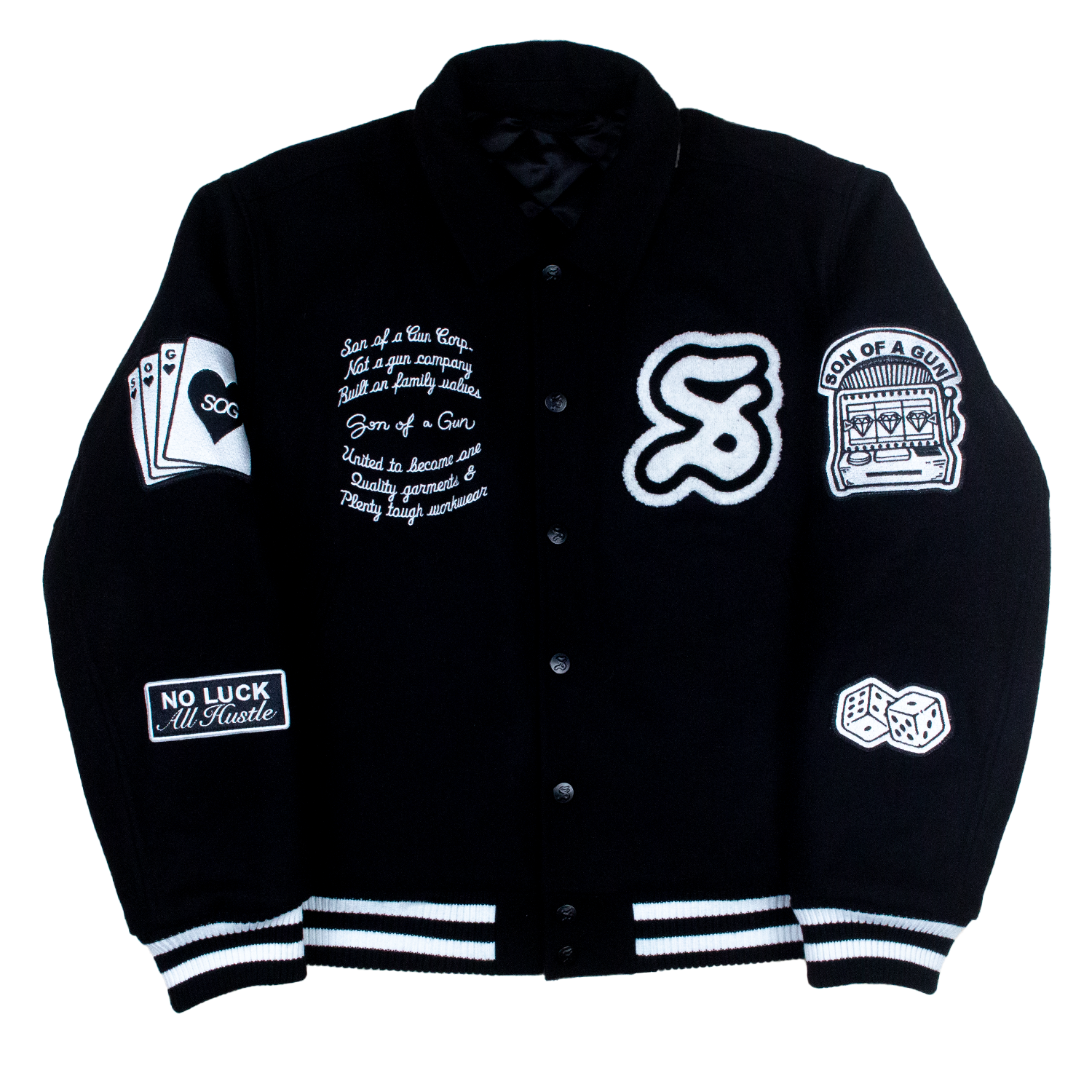 All In Varsity Jacket, crafted from a blend of wool and polyester and adorned with various embroidered patches including Chenille Embroidery. This limited edition jacket is a one-of-a-kind piece, never to be reproduced once sold out. Made in China with the utmost care and attention to detail.